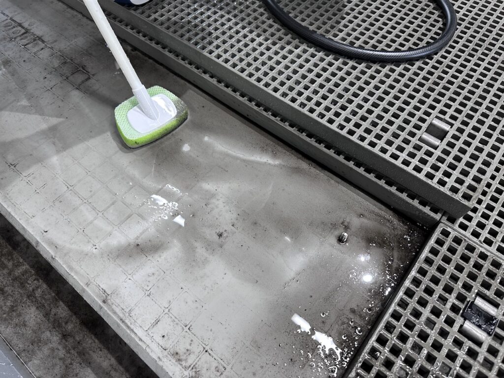 洗車場なので当然定期的に床洗浄が必要なのですが、貸し出し用のブースの床の汚れを落とすのがとても手強いとか・・・