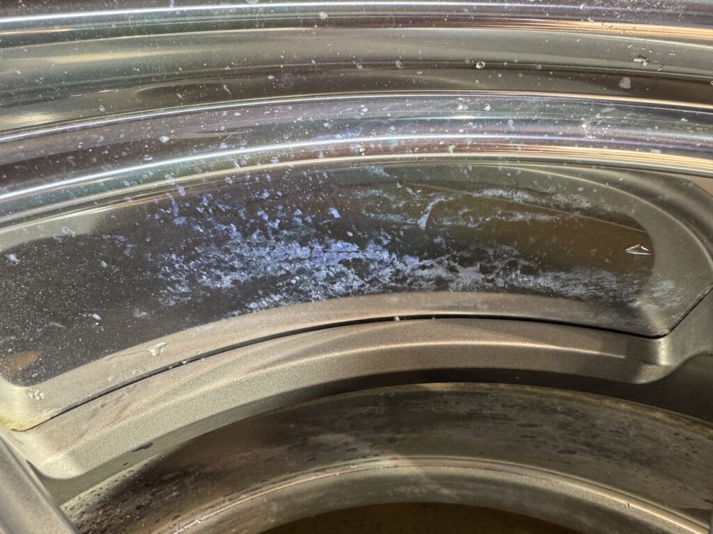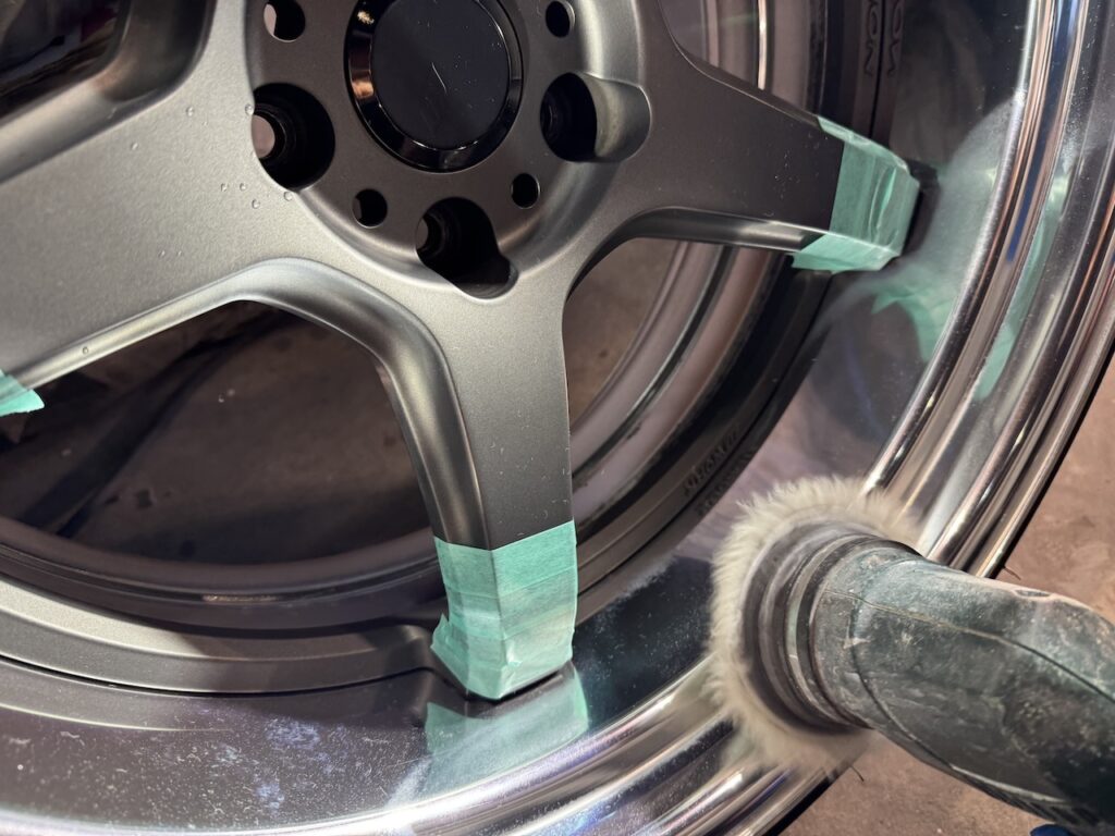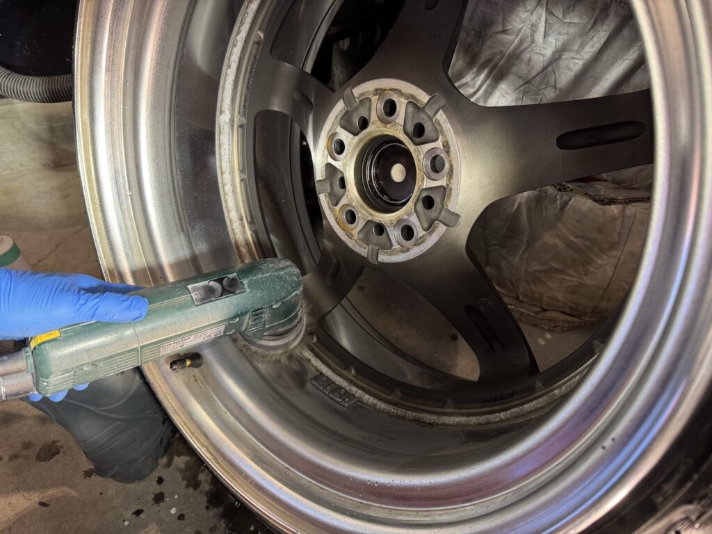 赤尾はと言うと、シミで残念な状態のカスタムホイールのリムを研磨。