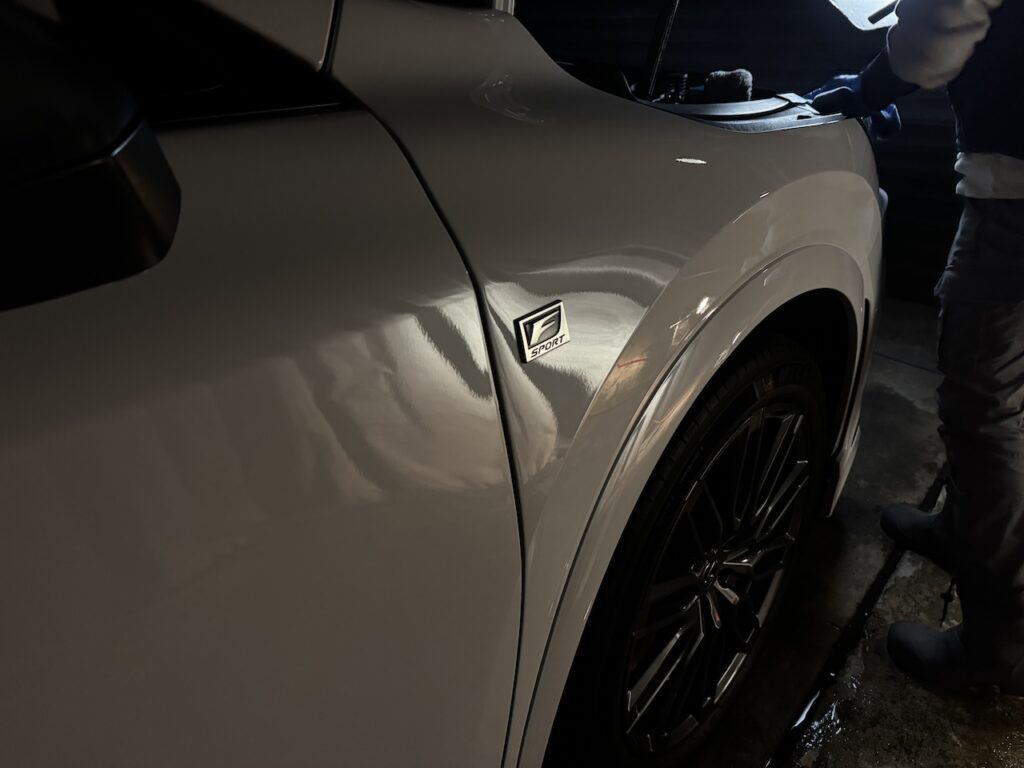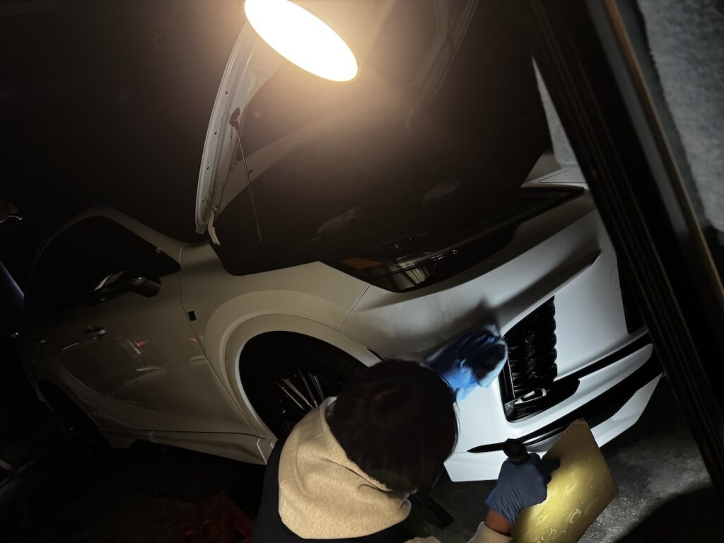 施工車両はホワイト系SUVで、特に下部やフェンダー周辺の汚れが付きやすい部分を重点的に処理。